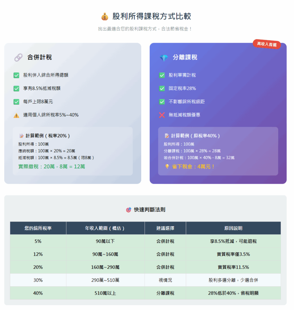 小王年薪 500 萬,去年股利收入 200 萬,他習慣性地選擇合併計稅,結果適用 40% 稅率。如果他選擇分離課稅(28%),光是股利這塊就能省下 24 萬!