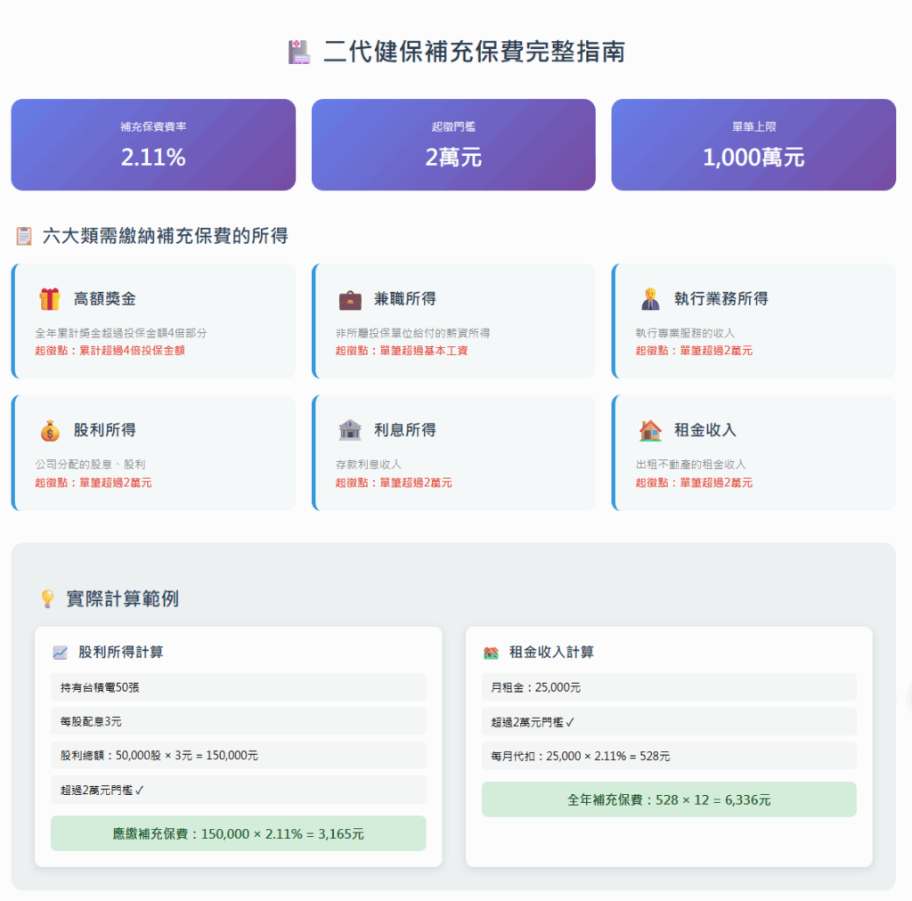 實際案例:王先生原本持有 0050 共 50 張,每次配息 10 萬元,要繳 2,110 元補充保費。後來分散投資 5 檔 ETF,每檔配息都低於 2 萬,完全免繳補充保費!