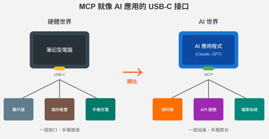 如上圖所示,就像 USB-C 讓你的筆記型電腦能夠連接到顯示器、儲存裝置和手機充電器,MCP 讓 AI 應用程式能夠連接到資料庫、API 服務和檔案系統。這種類比完美地展示了 MCP 的核心價值:一個接口,多種連接。