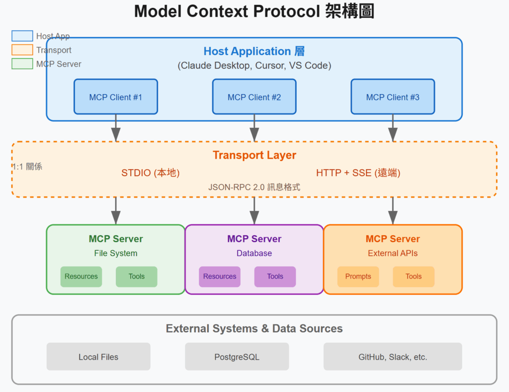 如架構圖所示,MCP 建立了一個分層的系統架構,每一層都有明確的職責和功能。讓我們深入了解每個組件的角色。