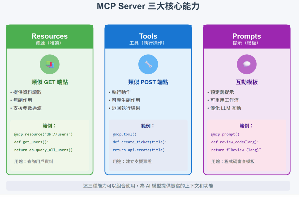 MCP 伺服器是協議的核心,它們透過三種基本原語提供功能: