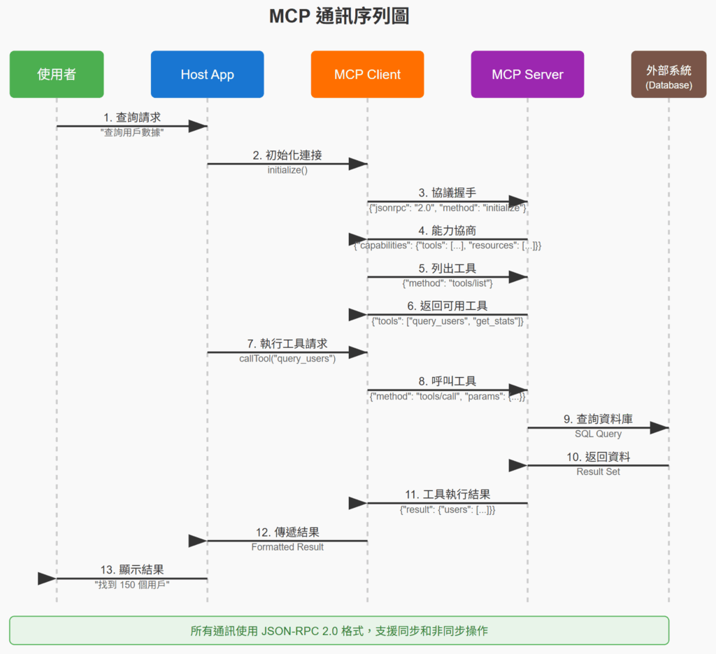 這個序列圖詳細展示了從使用者發起查詢到最終獲得結果的完整流程。每個步驟都使用標準的 JSON-RPC 2.0 格式進行通訊,確保了協議的一致性和可靠性。