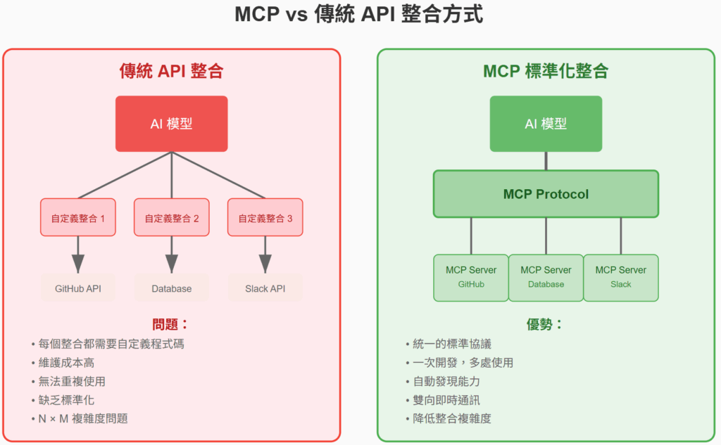 上圖清楚展示了傳統 API 整合方式與 MCP 標準化整合的差異。傳統方式需要為每個服務編寫自定義整合程式碼,而 MCP 提供了統一的協議層,大幅降低了整合複雜度。
