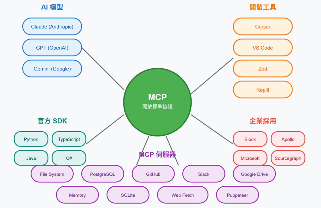 如生態系統圖所示,MCP 已經建立了一個蓬勃發展的生態系統,包括主要的 AI 模型供應商、開發工具、企業採用者,以及豐富的 MCP 伺服器實作。這個生態系統在 2024-2025 年間快速成長,展現了產業對標準化 AI 整合的強烈需求。